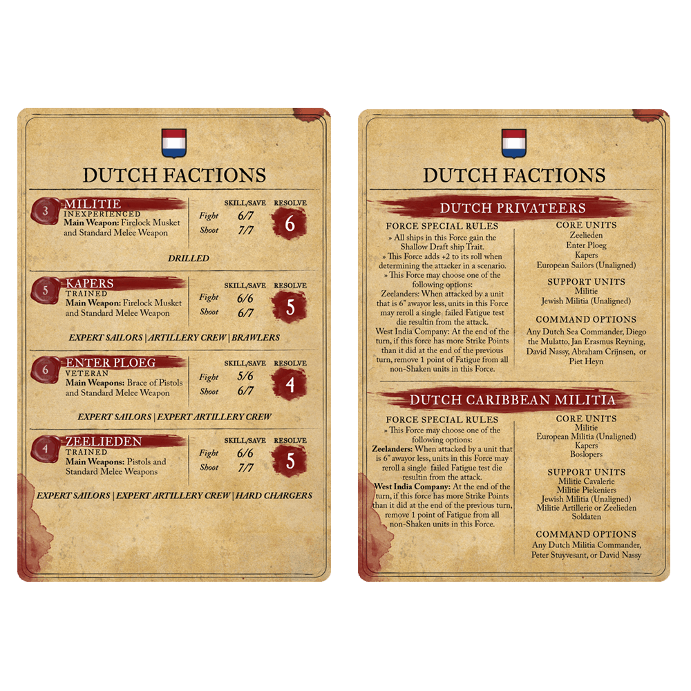 Dutch Caribbean Militia: The Dutch militias in the Caribbean and South America are largely a product of the Dutch West India Company. They are organized and armed similarly to those of the English and French with a couple of exceptions. First, they are often augmented by small numbers of hired professional soldiers. Second, given the great Dutch tolerance for a variety of religious faiths, especially as compared to other European nations, Dutch militias tend to be much more diverse. In Brazil, Surinam, and the Caribbean, it is not uncommon to have large numbers of Jews serving in the militia, and at least some companies appear to have been entirely Jewish. Dutch militia companies are typically of two sorts, reflecting the practice in the Netherlands: the Burgher Guard composed of social elites, and the common militia. As is ever the case, the effectiveness of militias depends on equipment, training, and how often they are called to arms to fight rather than drill. In Brazil and Surinam, Dutch militia companies are prepared in time of war to engage European enemies and are always prepared to defend against Native Americans protecting themselves from European encroachment. In the Caribbean, the Dutch militia companies seldom see action except in time of war, defending against raids and invasions, or augmenting Dutch expeditionary forces. Dutch militias are generally well-trained, and even merchants take great pride in their service. Long arms range from match-lock muskets and bandoliers with chargers to flintlock muskets and cartouche boxes, depending on the time and place, although the matchlock predominates through much of the century.