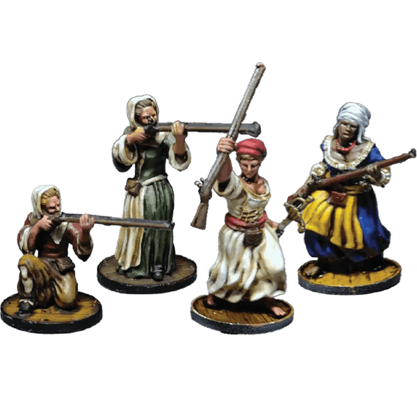 Wives of the Boucaniers, these Caribbean frontier women are known to be as skilled with their Buccaneer Guns as their husbands are. They carry on the hunting trade when their husbands are away raiding the Spanish.