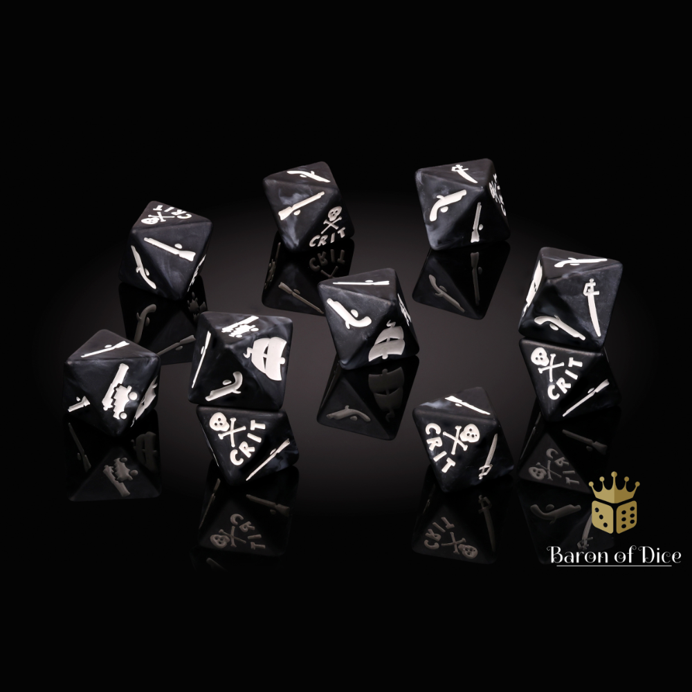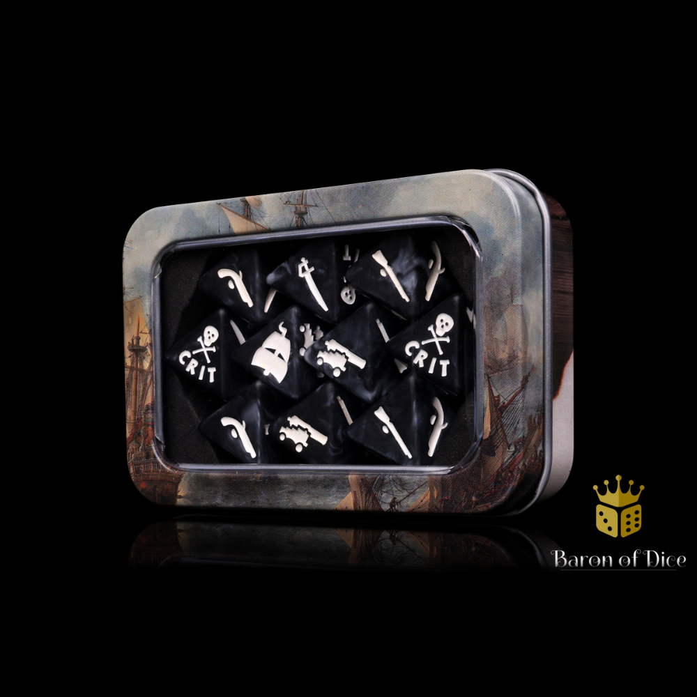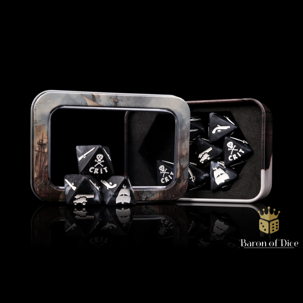 Pirates feature a matte black swirled with silver veins and inlaid with a pure white; resin 16mm dice. All dice are accompanied in a sweet metal tin surrounded by EVA foam. Show up in style!
